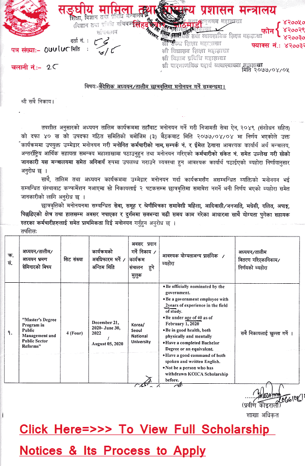 Scholarship Application Open Notice by Government of Nepal. Foreign Studies Scholarship application for various courses and levels. As per the details, the study training program will be nominated from there in accordance with the committee constituted under sub-section 40B of the Civil Service Act, 2049 (with amendments) as decided by the (3) meeting on 2077/04/04. Contact No. And send the email address to the Ministry of Finance, International Financial Assistance Coordination Division for necessary work, and the code of the nominated employee no. It is requested that the information be sent to this ministry as per the decision sent to make necessary arrangements.