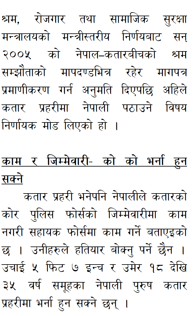 It has been said that Nepalis will work in the auxiliary force instead of working under the responsibility of Qatar’s core police force. They do not have to carry weapons. Nepali men in the age group of 18 to 35 years of 5 feet 7 inches height people can be recruited in the Qatar Police.
