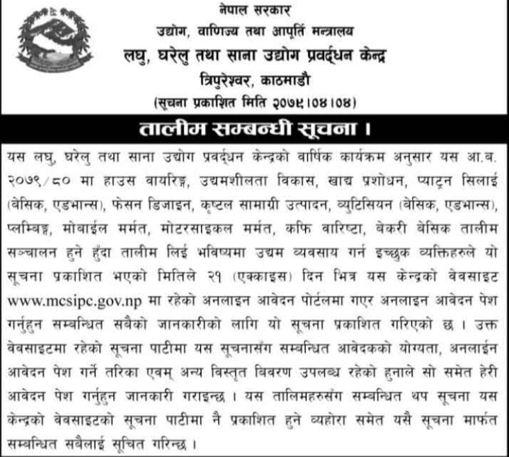 Free Skill Training Application open by the Government of Nepal, Ministry of Industry, Commerce and Supplies published notice regarding free skill & technical training application form fill up. Small, cottage and Small Industry Promotion Center Free Training information for all nepali citizens. Government of Nepal Ministry of Industry, Commerce and Supply Micro, Domestic and Small Industry Promotion Center Information regarding training.