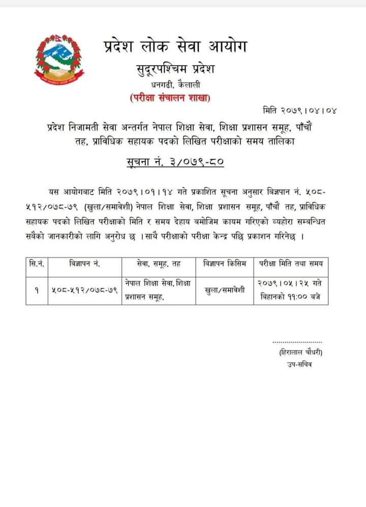 Nepal Education Service Administration Group 5th Level Technical Assistant Post Written Exam Time Table under Provincial Civil Service