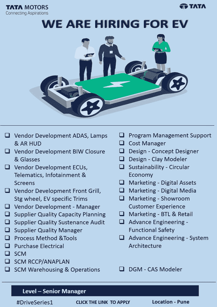 Presenting an exciting opportunity to work with India’s leading EV OEM, Tata Passenger Electric Mobility Ltd. Inviting all applicants for various job opportunities. Don’t miss this Hiring Drive for EV. Click the link provided below to apply or know more about the eligibility criteria. Do share this with your network, friends and family members who are interested in being a part of the EV industry.
