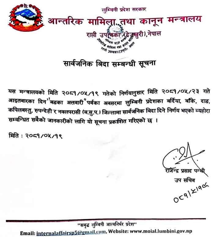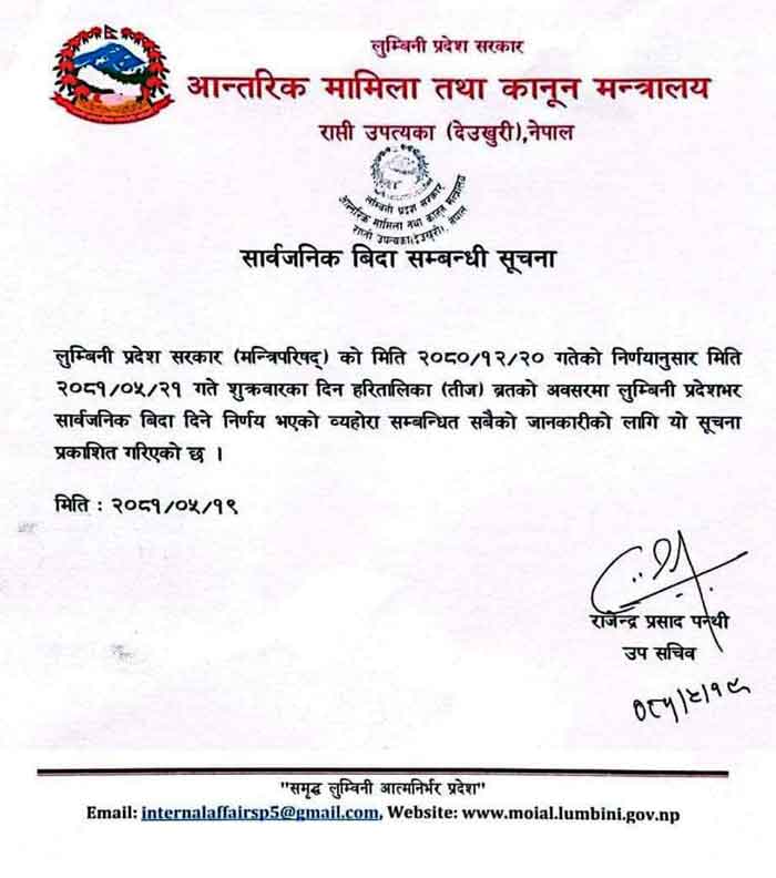 The government of Nepal, Province Government published a public holiday notice regarding various festivals & occasions. View all upcoming public holiday sarabajanik bida list update notice. Public holiday in Lumbini across the Pradesh Province on Friday and 6 districts on Sunday. The Lumbini Pradesh government has given a holiday to 6 districts of the Teej on Friday, the day of women’s fast, and on Sunday, the day of Tharu men’s fast. On the occasion of women fasting on Haritalika Teej, a holiday was given across the Lumbini region.